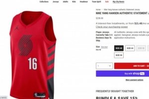 体育资讯7月7日讯 近日据某波特兰华人、抖音博主爆料,杨瀚森球员服开始定价250刀,该抖音博主在线下直营店反映“250”不好听后经店家汇报申请该球衣的价格就改成了238刀。