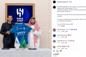 特奥社媒发文纪念加盟新月:很高兴宣布我加盟了沙特最大的俱乐部