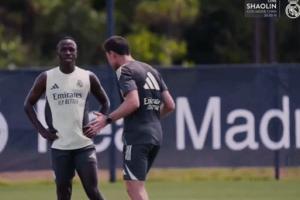在皇马训练中,阿隆索与维尼修斯沟通,似乎是在让维尼修斯更多的向对手施压。